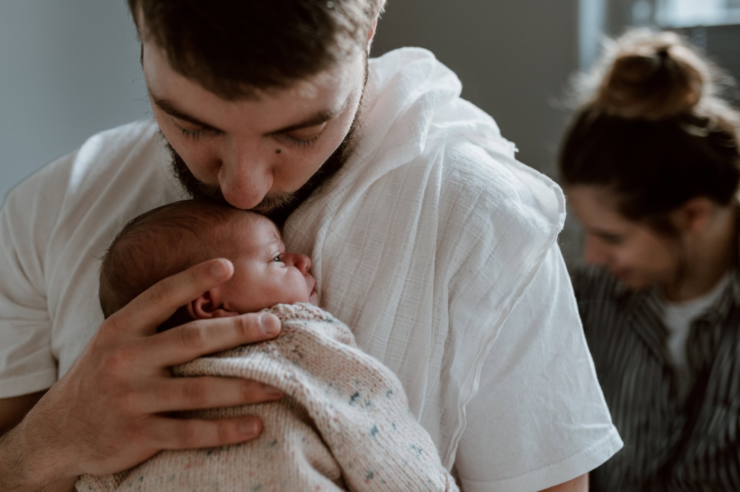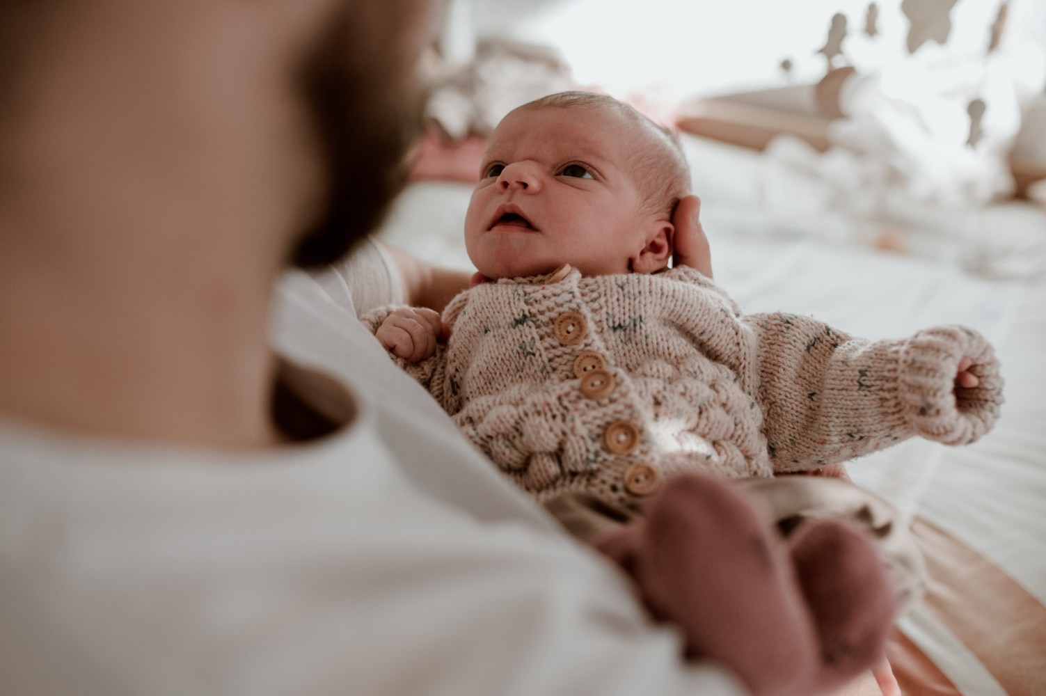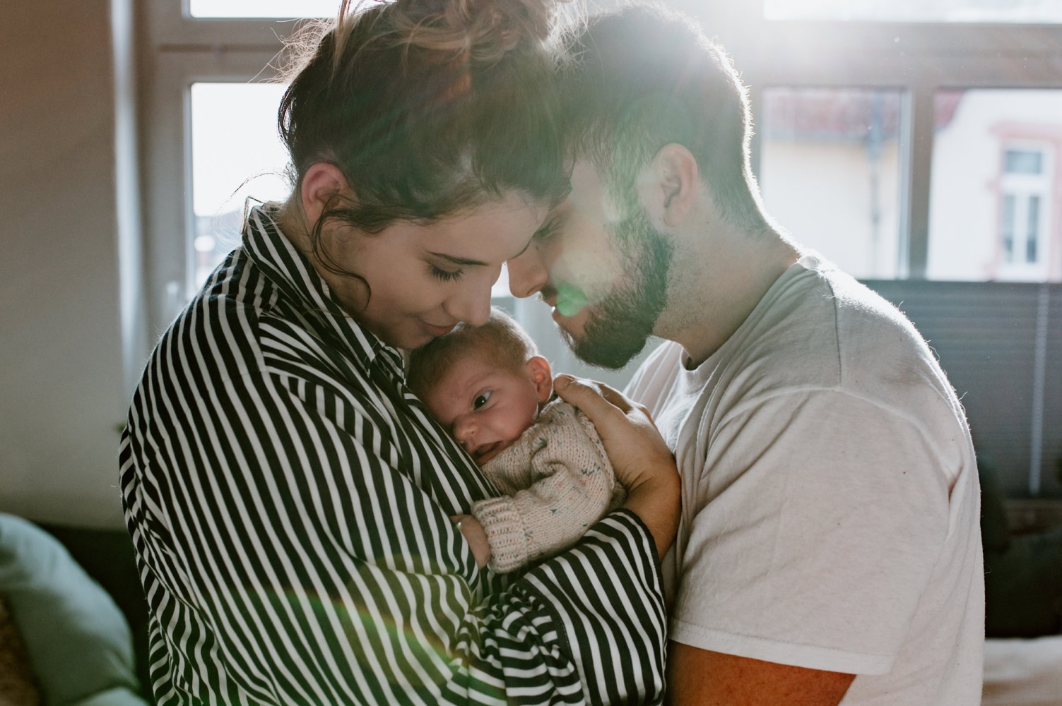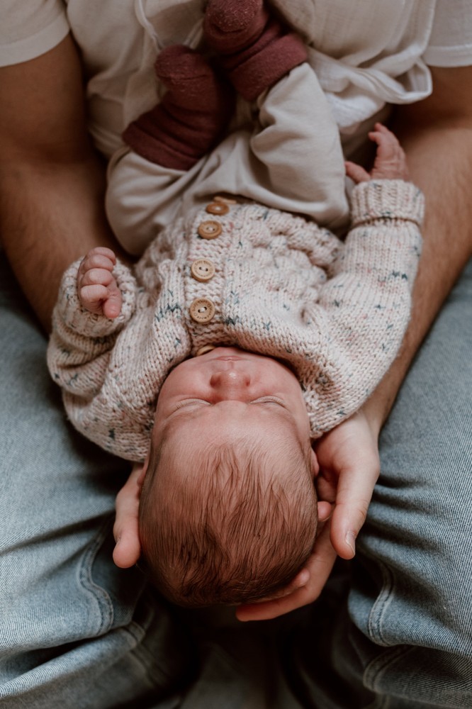In erster Linie: entspannt und ohne Druck. Ich bringe viel Zeit mit, sodass ich mich ganz auf euch und euer Baby einlassen kann. Einen Teil der Bilder halte ich dokumentarisch fest. Das heißt, ich begleite euch fotografisch bei dem, was ihr macht: wickeln, stillen oder füttern, kuscheln, spazieren gehen… Von eurem Nachwuchs mache ich Detailaufnahmen und selbstverständlich dürfen Familienbilder nicht fehlen. Dafür suchen wir uns eine möglichst helle und gemütliche Ecke in eurem Zuhause, wo ich euch gemeinsam ablichte.