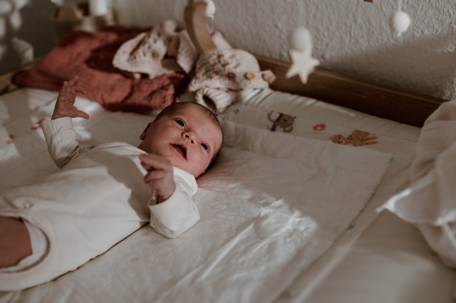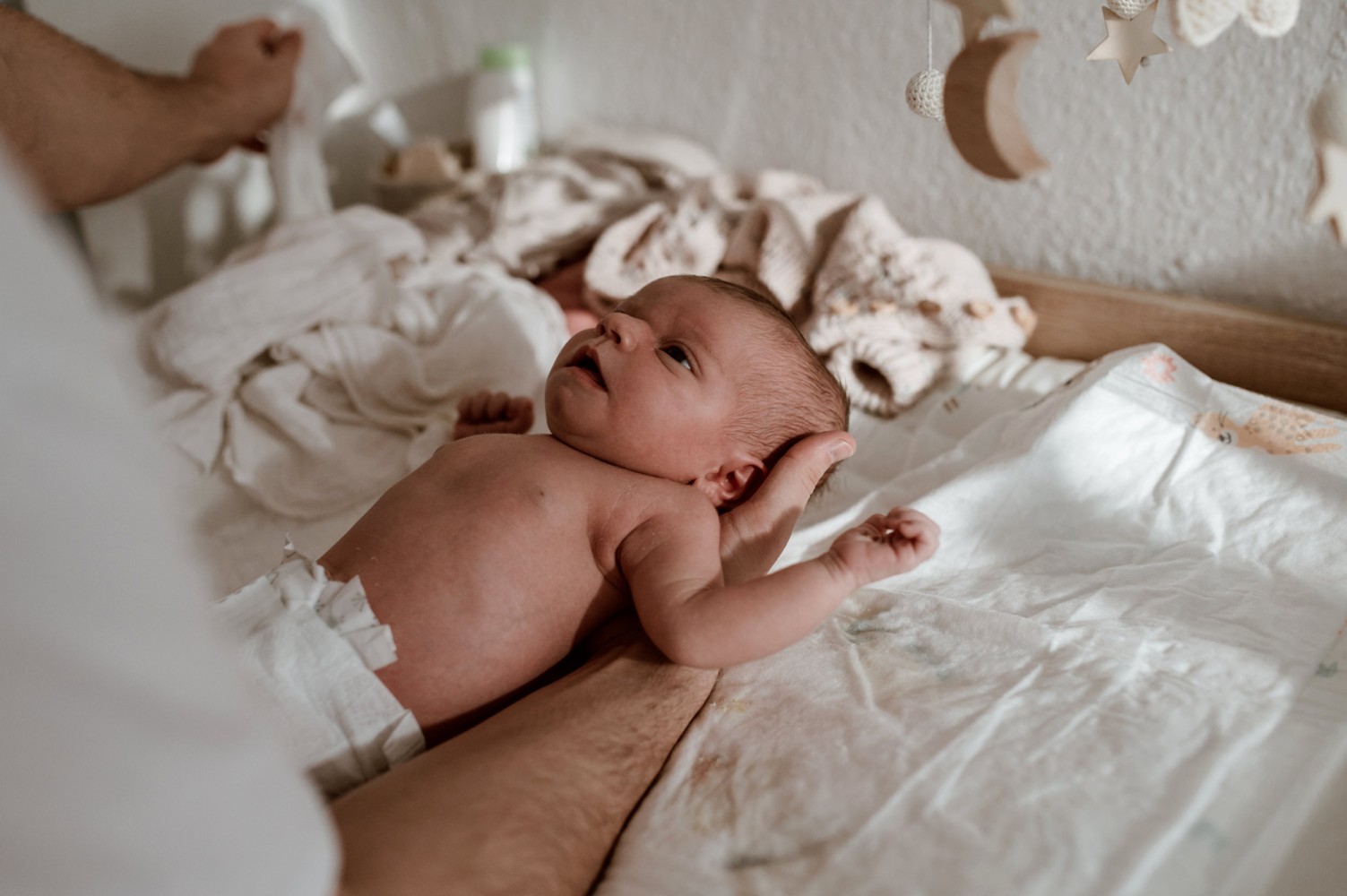 Ich begleite euch und euer Neugeborenes fotografisch in euren eigenen vier Wänden. Der ideale Zeitraum liegt im Alter zwischen 5 und 14 Tagen eures Babys, da es in dieser Zeit noch viel schlummert. Aber aus eigener Erfahrung weiß ich, dass mancher Start ins Wochenbett viel Ruhe braucht, von daher kann solch ein Shooting selbstverständlich auch später stattfinden.